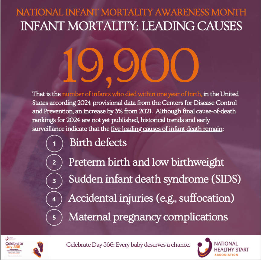The National Healthy Start Association’s annual campaign, in recognition of National Infant Mortality Awareness Month, is a call to action to improve the health and well-being of women, infants, children, and families to ensure all babies can celebrate their first birthdays. Throughout September, Healthy Start projects and other organizations concerned with the issue and importance of infant mortality recognize NIMAM.